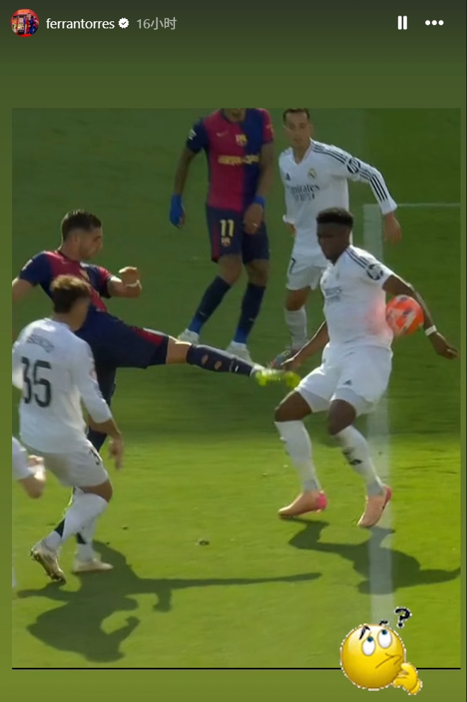 赛后费兰-托雷斯在自己的社媒中晒出了琼阿梅尼手球挡出射门的瞬间,并配上了一个若有所思的表情,显然是对裁判的判罚另有看法。